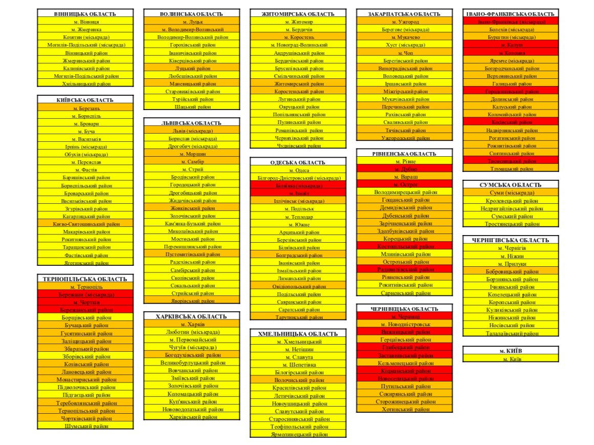 Київ, як і раніше, лишається у жовтій зоні. Натомість побільшало жовтих і помаранчевих зон у Київській області.