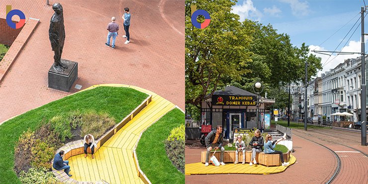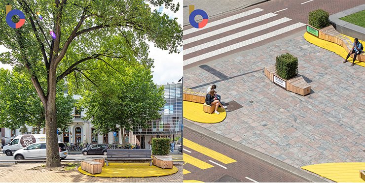 Облаштування перехрестя доручили бюро Bende, яке спеціалізується на вуличному дизайні. Дизайнери позначили пішохідну зону, перефарбувавши дорожню розмітку з білої на яскраво-жовту, та створили острівці за допомогою вуличних меблів і квітників.
