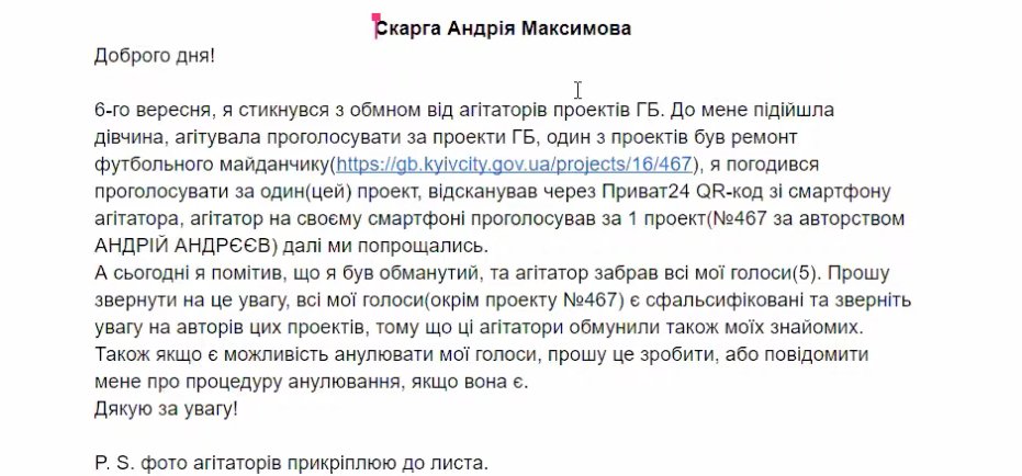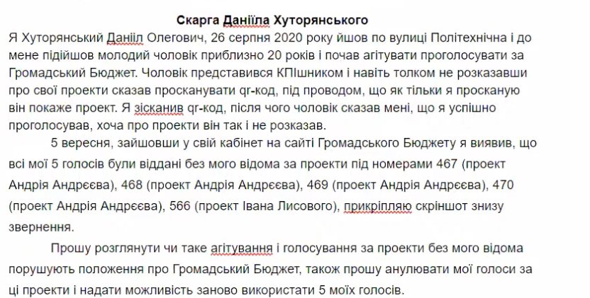 Також низка киян заявила, що їхні голоси було вкрадено: агітатори на вулиці пропонували перехожим проголосувати зі смартфона за один із проєктів, ті погоджувалися і згодом виявляли, що використано не один, а всі п’ять голосів.