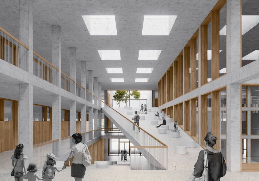 З вхідної площі можна потрапити в лобі дитсадка й школи, з яким пов’язані всі простори громадського призначення. Спортивний зал відгороджений скляними стінами від галерей та відкритого простору з рампами. Сама школа та внутрішній двір дитячого садка поєднані галереями, що створюють додаткові шляхи циркуляції повітря та евакуації людей. Архітектори зазначають, що у проєкті застосували ключовий принцип дизайну – забезпечити взаємодію внутрішнього й зовнішнього простору.
