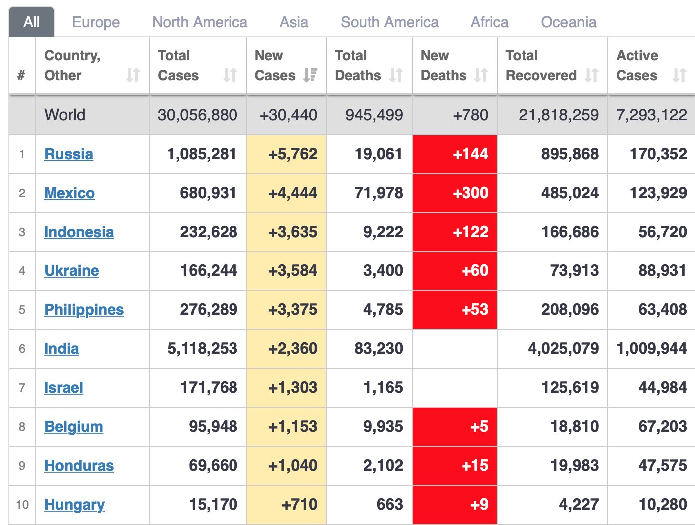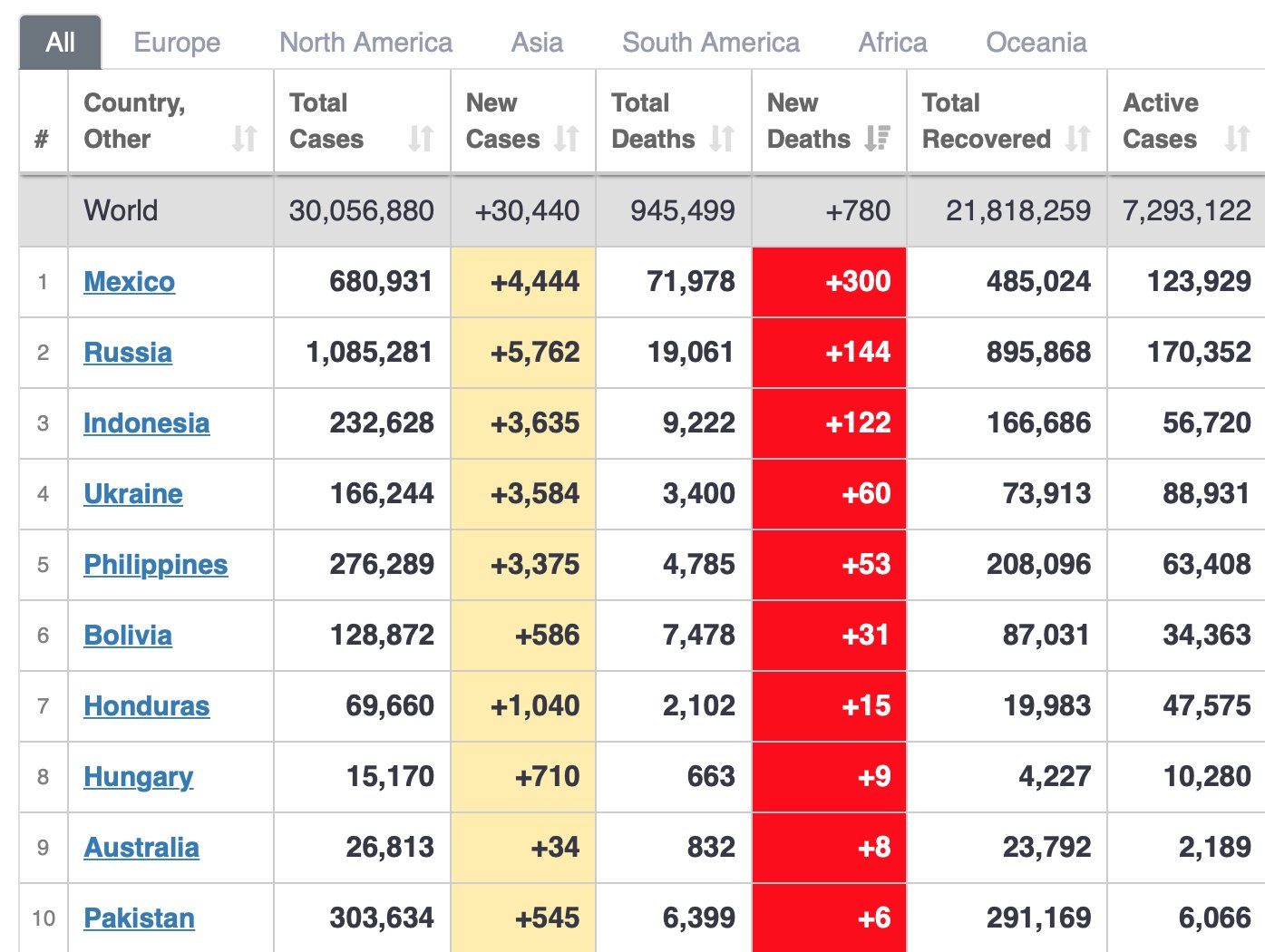 За даними worldometers.info, кількість випадків інфікування у світі вже сягнула 30 мільйонів, а кількість смертей (945,5 тисячі) наближається до мільйона.