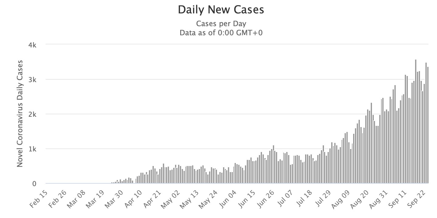 Динаміка захворюваності в Україні за кількістю нових випадків щодоби. Графік: worldometers.info