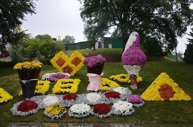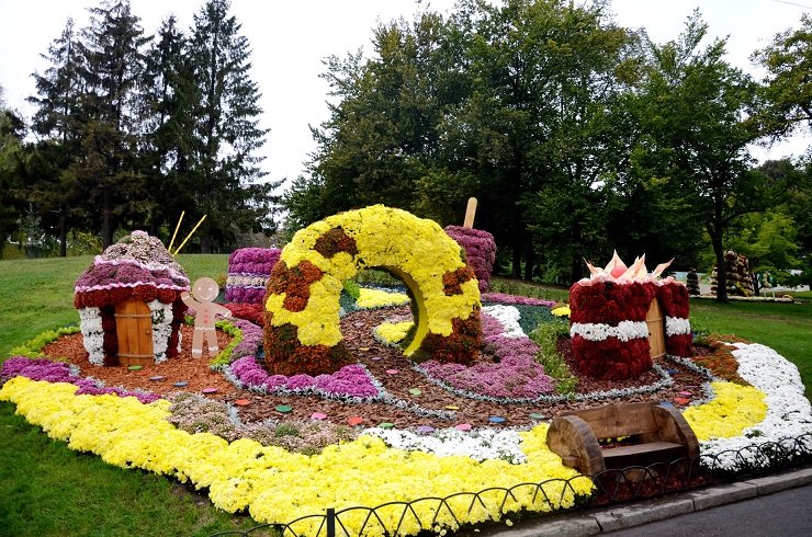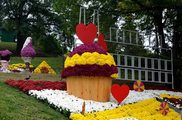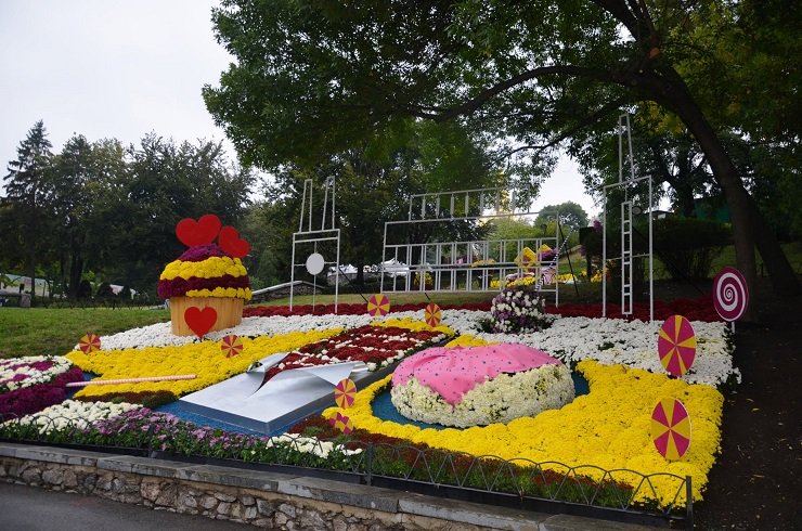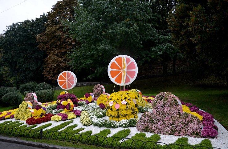 На Співочому полі відкрилася виставка хризантем з десяти композицій, присвячена «Світу солодощів», повідомляє КО «Київзеленбуд». Її створили із 30 тисяч хризантем.