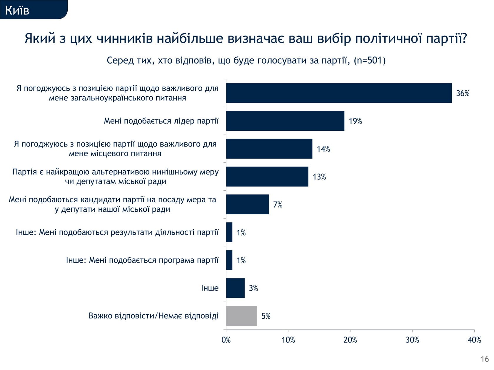 36% киян пояснили, що на їхній вибір найбільше впливає позиція партії щодо загальноукраїнського питання. 19% зробили свій вибір через симпатії до лідера чи лідерки партії. 14% обирають відповідно до позиції партії щодо місцевих питань.