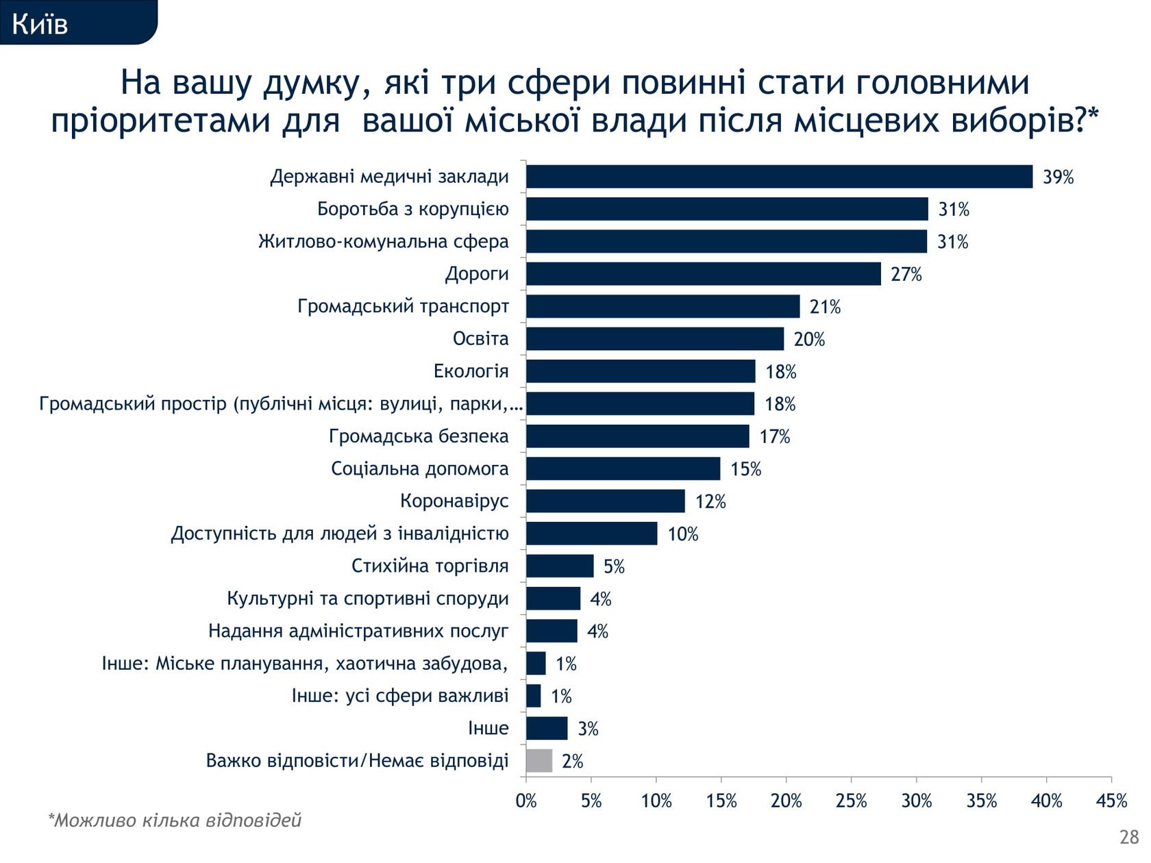 Чи не найбільше киян хвилює сфера охорони здоров’я – 39% опитаних назвали медичні заклади серед пріоритетів міської влади. Також у топ-5 найпопулярніших відповідей: боротьба з корупцією, житлово-комунальна сфера, дороги и громадський транспорт.