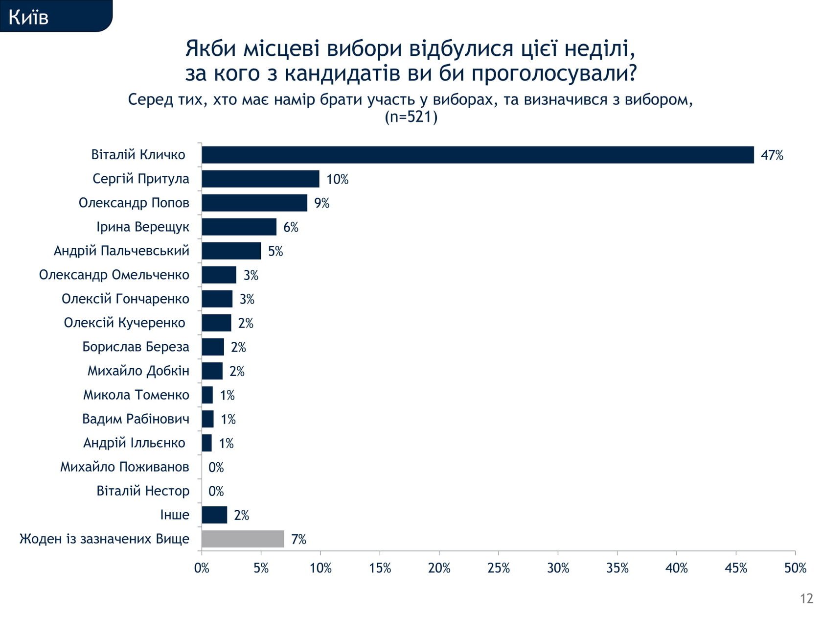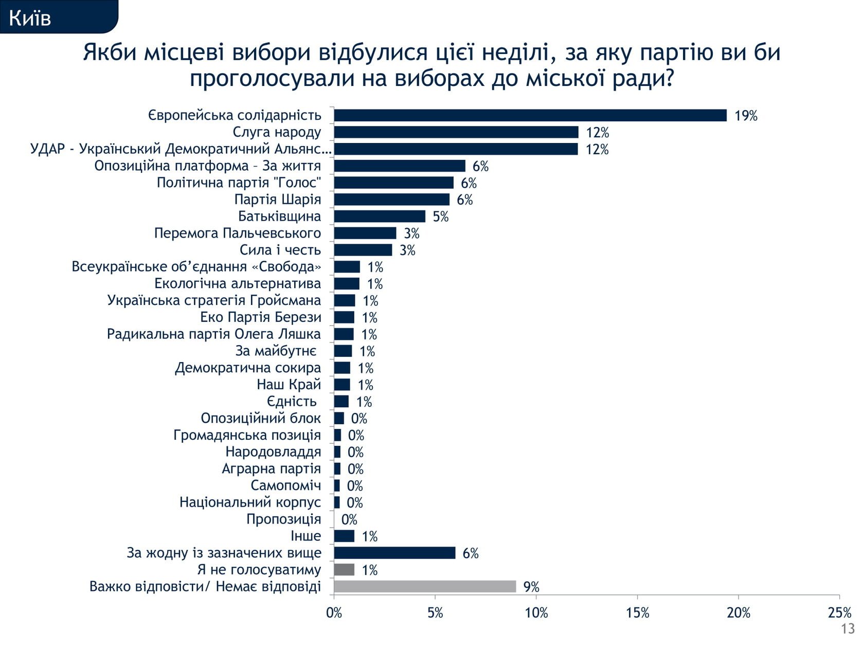 Так, згідно з опитуванням, 53% киян вважають, що їхня якість життя та захищеність залежать від дій центральної влади, 28% – що від дій місцевої влади. 49% вважають, що справи в Києві загалом ідуть у неправильному напрямку, а 38% – у правильному.