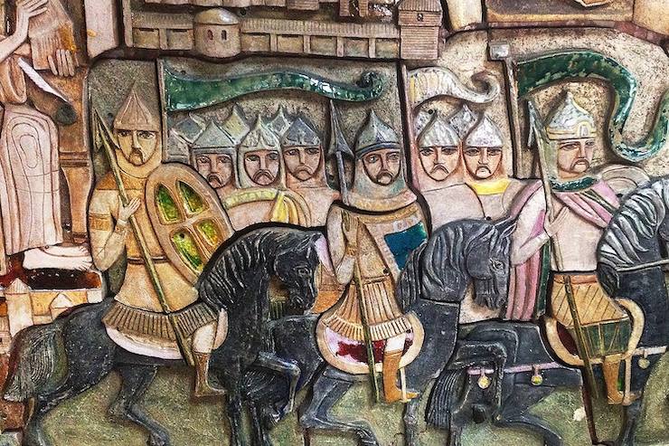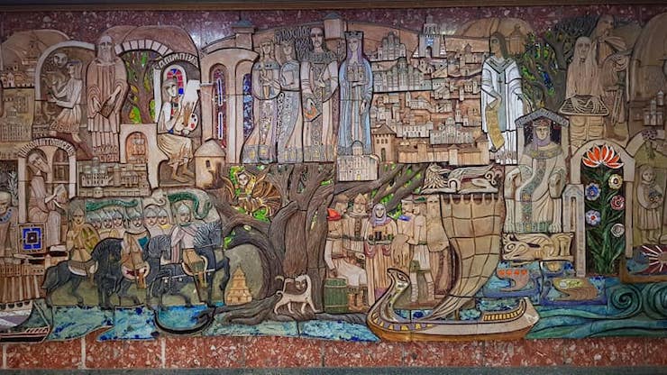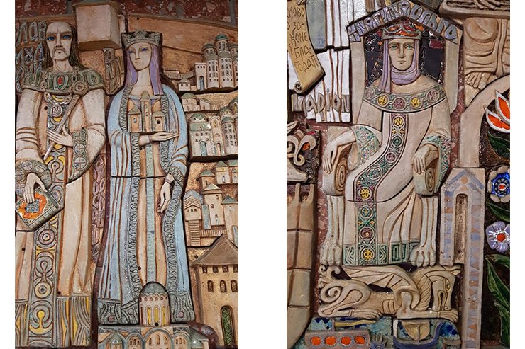 На панно зображені княгиня Ольга та князь Ярослав з донькою Анною – королевою Франції, птах Сирин та герої стародавньої історії Києва.