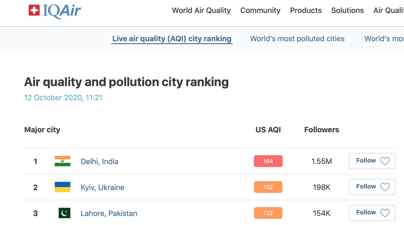 У Києві спостерігається високий рівень забруднення повітря – за даними IQAir, станом на ранок 12 жовтня українська столиця перебуває на другому місці за цим показником, поступаючись лише індійському Делі.