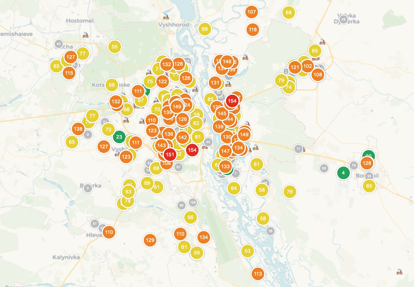 На мапі SaveEcoBot, яка показує дані з різних датчиків по Києву, високий рівень забруднення повітря фіксується практично в усіх районах міста. На проспектах Науки і Глушкова, а також в районі Лісового масиву – найвищий, «шкідливий», рівень забруднення.