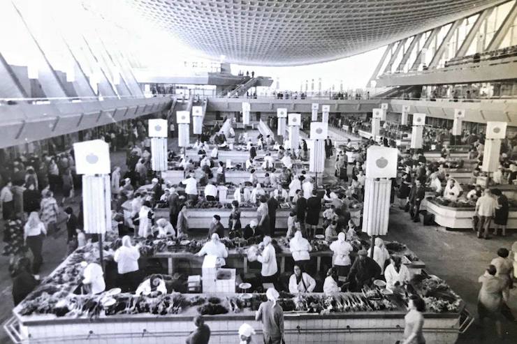 Житній ринок під час відкриття критого павільйону. «Критим він став у 1974-1980 роках і зараз, разом зі своєю незвичною вигнутою стелею, є однією зі знакових модерністських споруд Києва». Фото з архіву Пшеничного