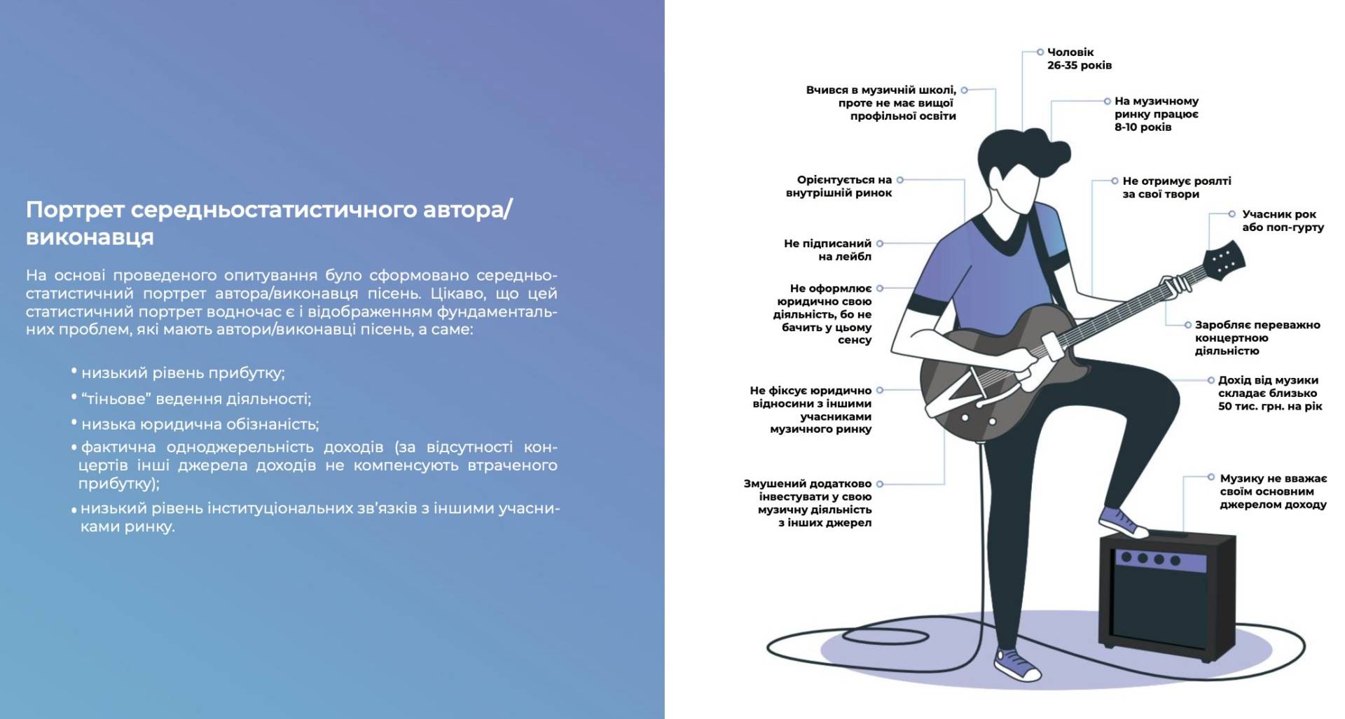 Автори склали типовий портрет українського музиканта – це чоловік 26-35 років, учасник рок- або поп-гурту, який заробляє переважно концертами. Українська музична індустрія – «чоловічий бізнес», частка жінок у ній становить 29%. Водночас, як зазначається у дослідженні, це приблизно відповідає ситуації в деяких інших країнах – так у Великій Британії ця частка становить 20%, а в США – 22%.