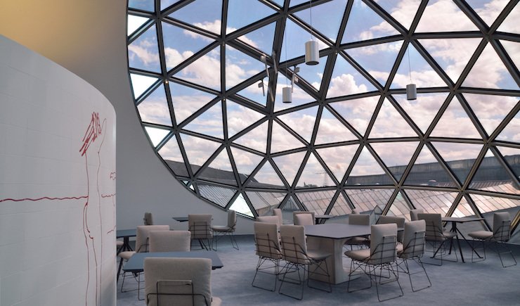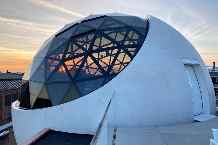 Сфера діаметром 12 метрів зроблена зі скла та білого бетону. Її поділено на дві півкулі, в одній із яких розташували ресторан, а в іншій – бар.
