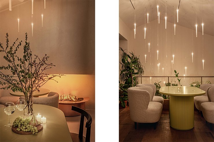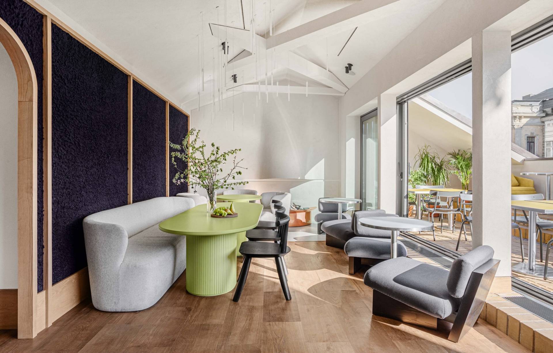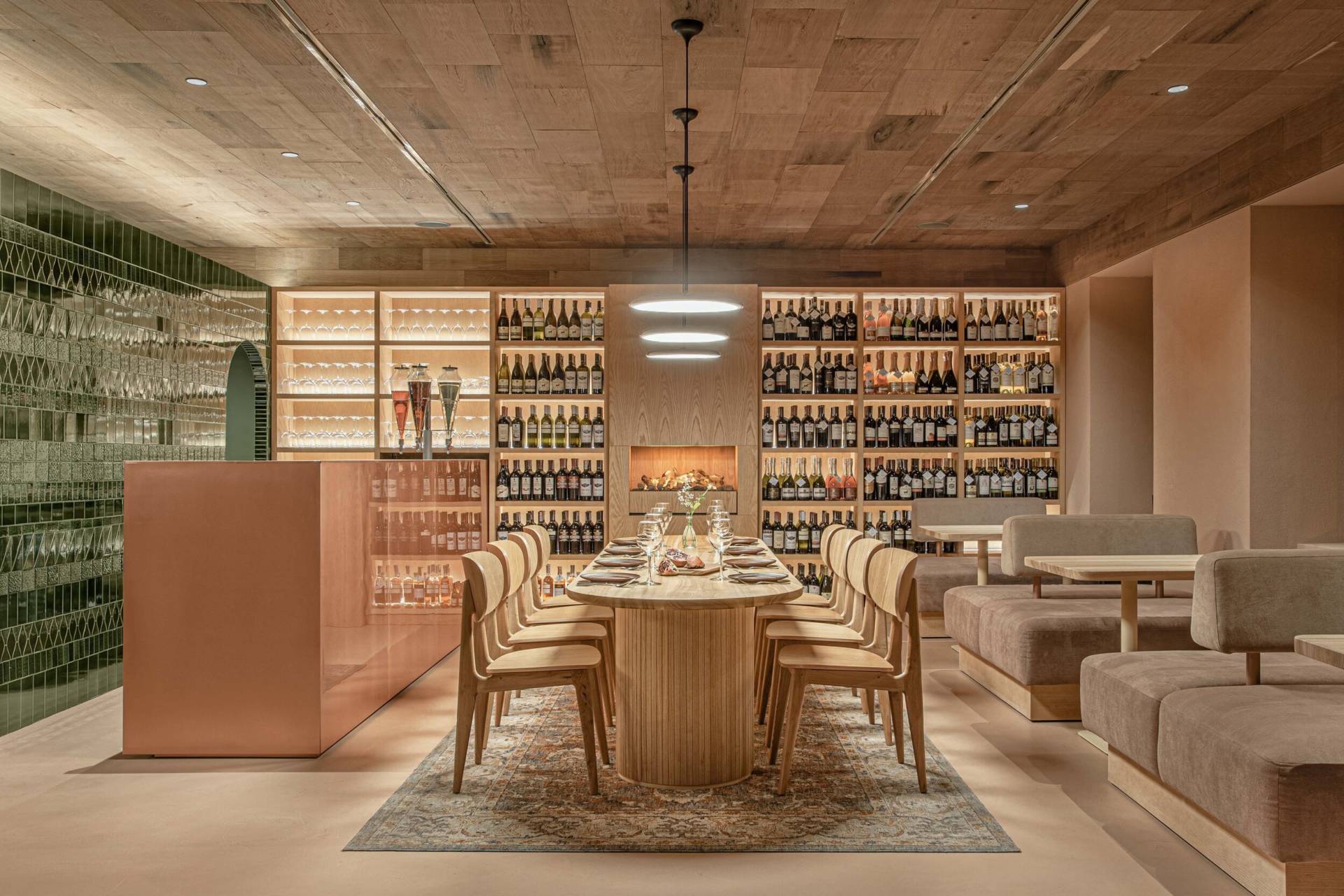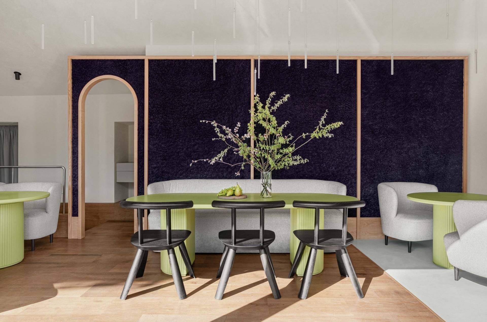 За концепцією градієнта, світлі стіни переходять у дерев’яну стелю, зроблену зі старовинного дуба 50-літньої витримки, який, своєю чергою, плавно утворює підлогу третього поверху.