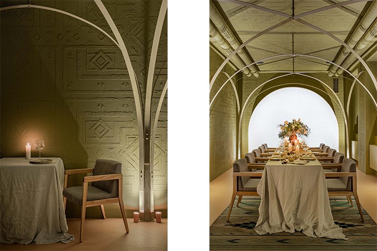 Приміщення також оздоблено металевими склепіннями та ширмою з льняної тканини у формі арки. За шторою захована невелика гардеробна для відвідувачів і технічний ліфт для подачі їжі.