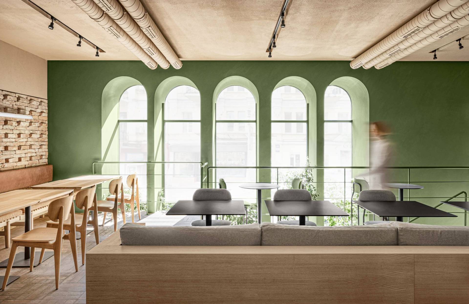 Архітектурним елементом першого поверху стали аркові вікна, які виходять на фасад з боку Прорізної. Проєктувальники зберегли оригінальні укоси вікон і пофарбували стіни у свіжий зелений колір.