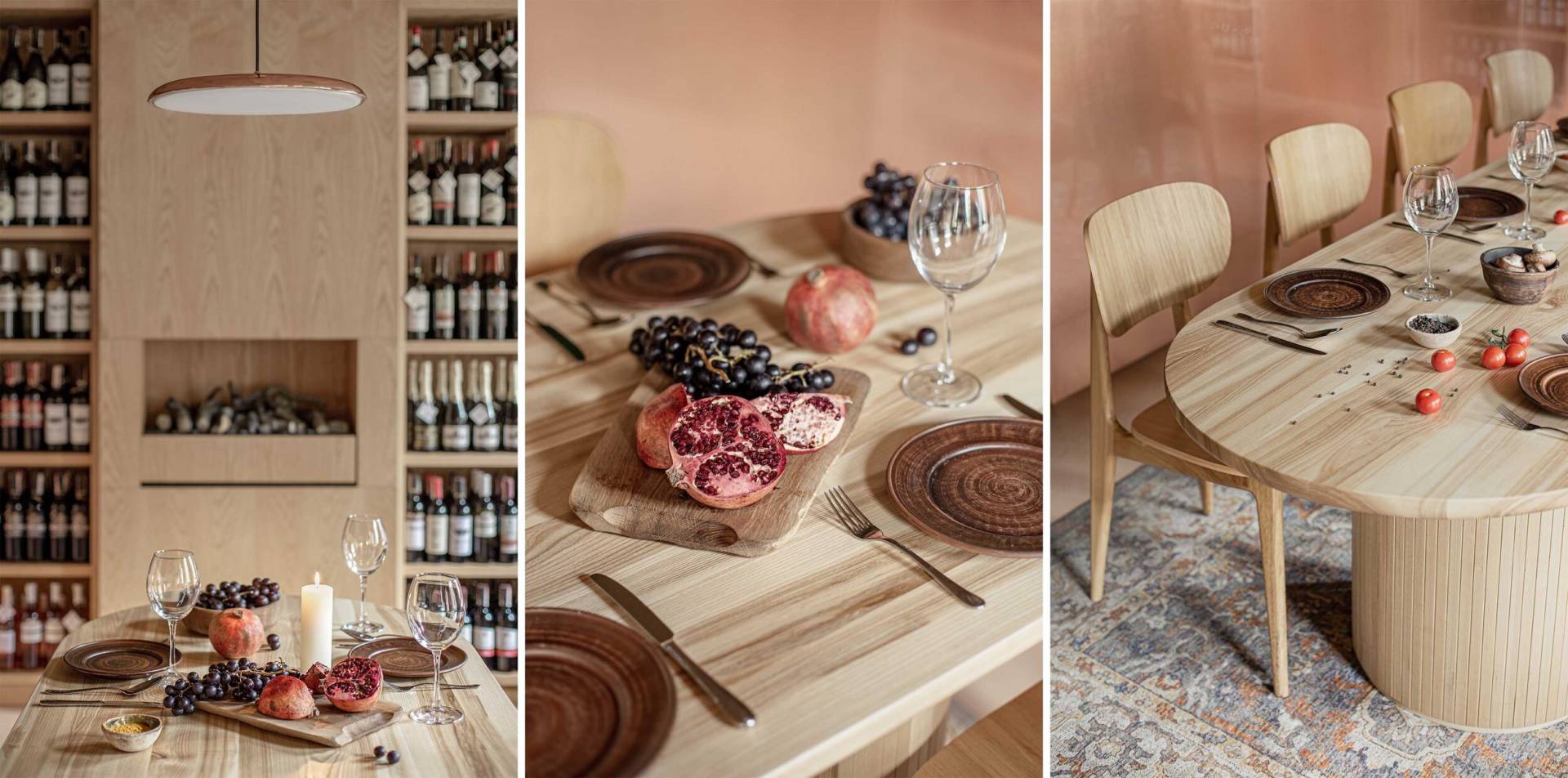 У центрі зали біля комину стоїть великий стіл із дерев’яними стільцями для сімейного застілля. Атмосферу доповнює дерев’яний стелаж з багатою колекцією грузинських вин.