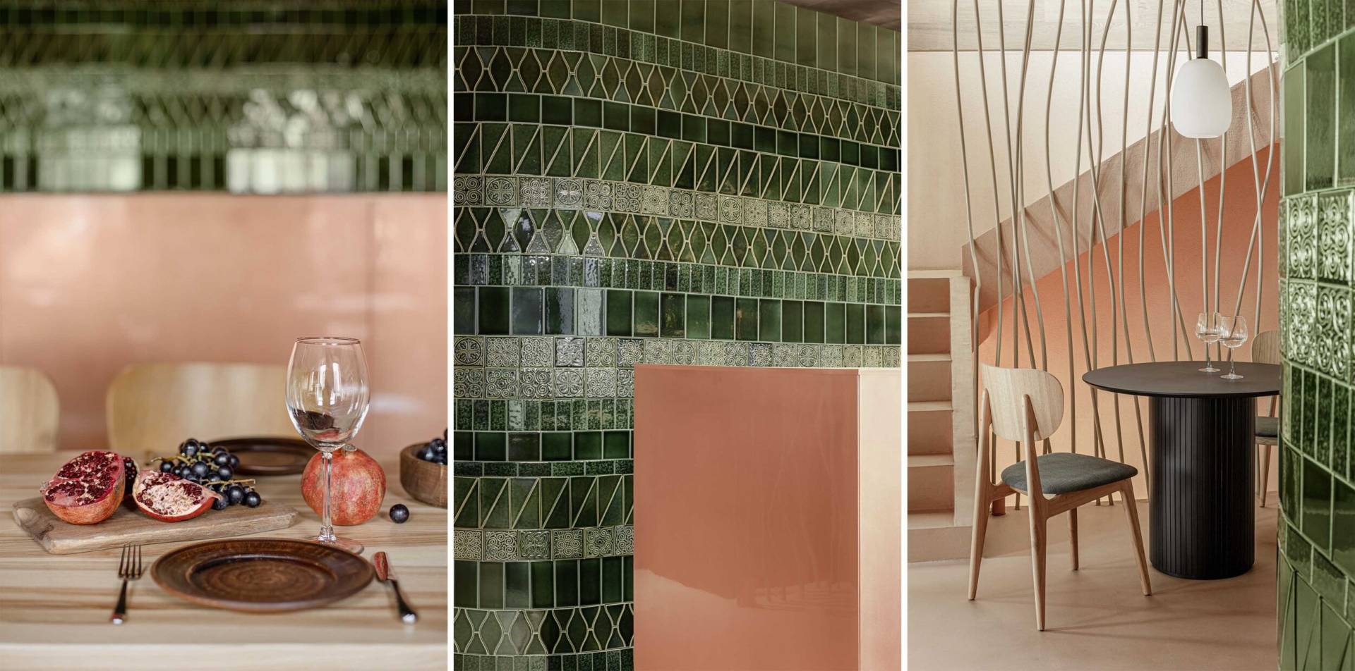На тлі зеленого боксу вирізняється бар із міді. З цього ж металу виготовлені світильники над великим столом.