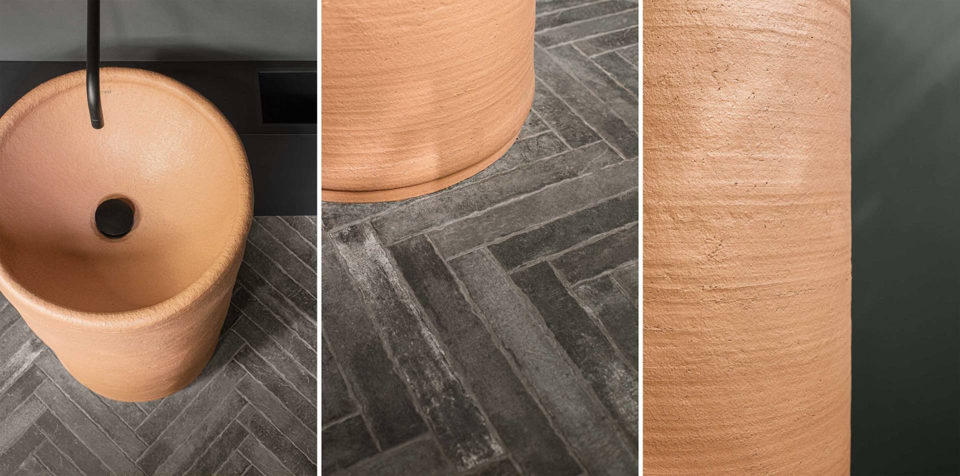 Сходи з чорної клінкерної плитки ведуть до цокольного поверху, де облаштована вбиральня з глиняним умивальником ручної роботи.