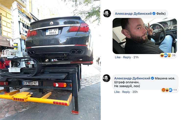 Водночас під аналогічним постом журналіста Bihus.Info Максима Опанасенка Дубінський написав, що машина належить таки йому і штраф оплачено. А також додав: «Не заздри, лох».