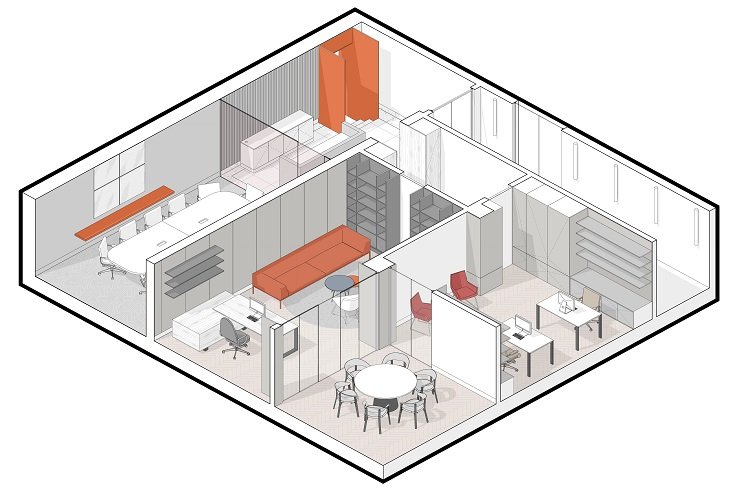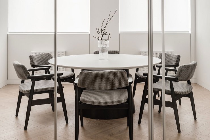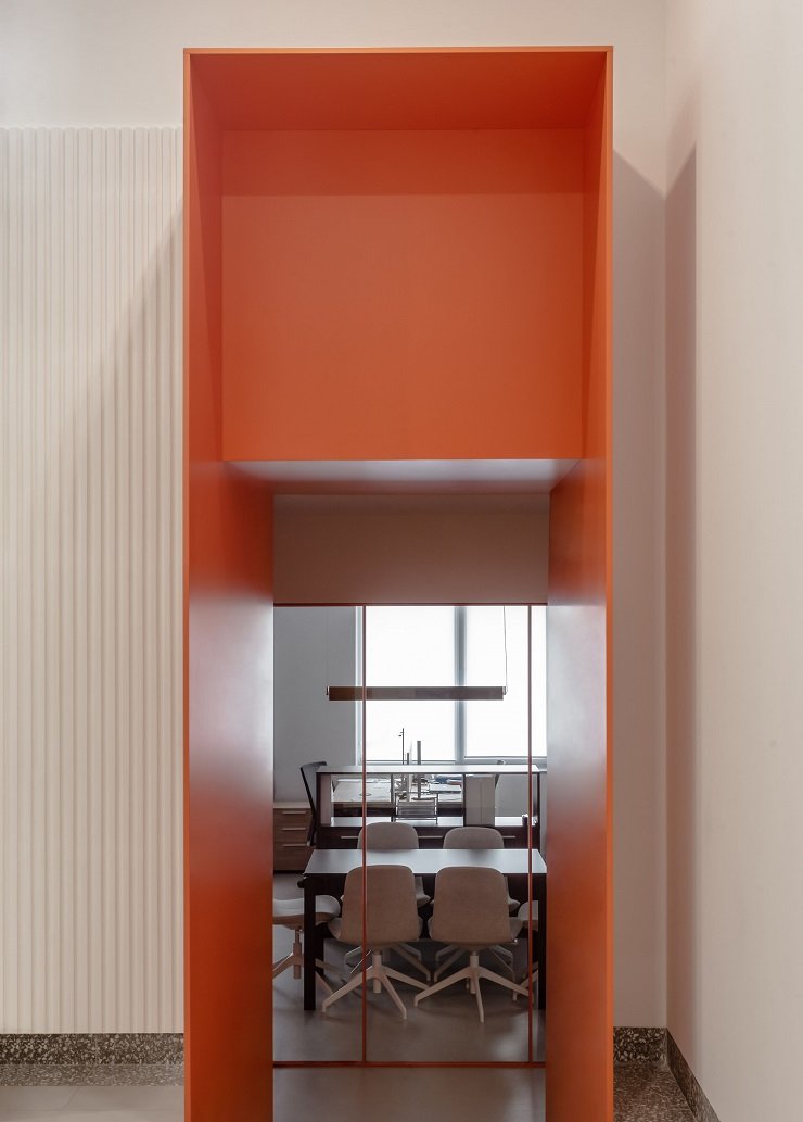 У кабінетах чотириметрові стіни заповнили мінімалістичними шафами і полицями, а в переговорних висоту сегментували розподілом листів гіпсокартону.