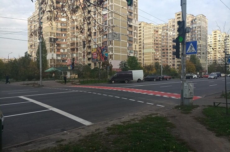 КП ШЕУ Деснянського району  КК «Київавтодор» закінчили поточний ремонт дорожнього покриття. В рамках нанесення горизонтальної розмітки були поновлені велосипедні переїзди веломаршруту «Троєщина – Центр»: