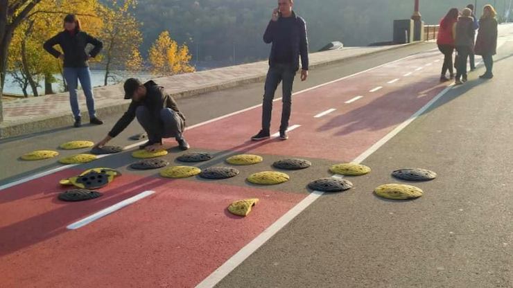 27 жовтня невідомі встановили на велосипедній доріжці пішохідного мосту через Дніпро на Труханів острів засоби заспокоєння руху, повідомляють у велоспільнотах Києва.