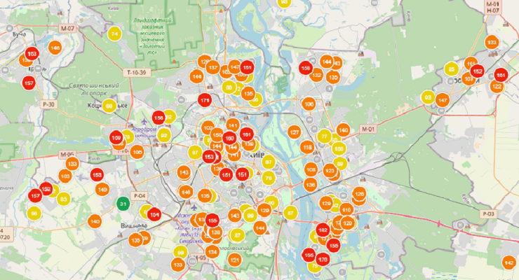 Індекс забруднення повітря у Києві становить 132 пункти за норми у 50 пунктів. Рівень забруднення повітря у столиці характеризується як «нездоровий для чутливих груп».