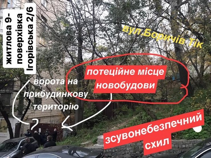 За його словами, неназвані представники забудовника прийшли зносити паркан житлового будинку на Ігорівській. Вони не мали при собі жодних документів, лише рішення Київради про відведення сусідньої ділянки, за адресою Боричів Тік, 4А, під забудову з підземним паркінгом.