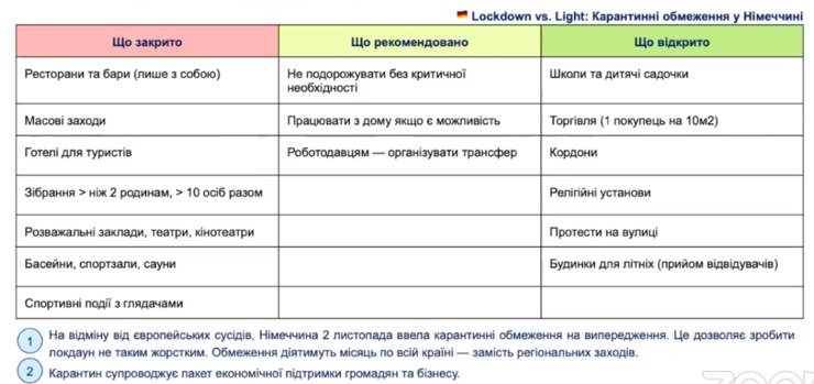 Упродовж листопада в Німеччині заборонені масові заходи, закриті розважальні заклади, ресторани та бари, але працюють школи і дитячі садочки, а також дозволена торгівля.