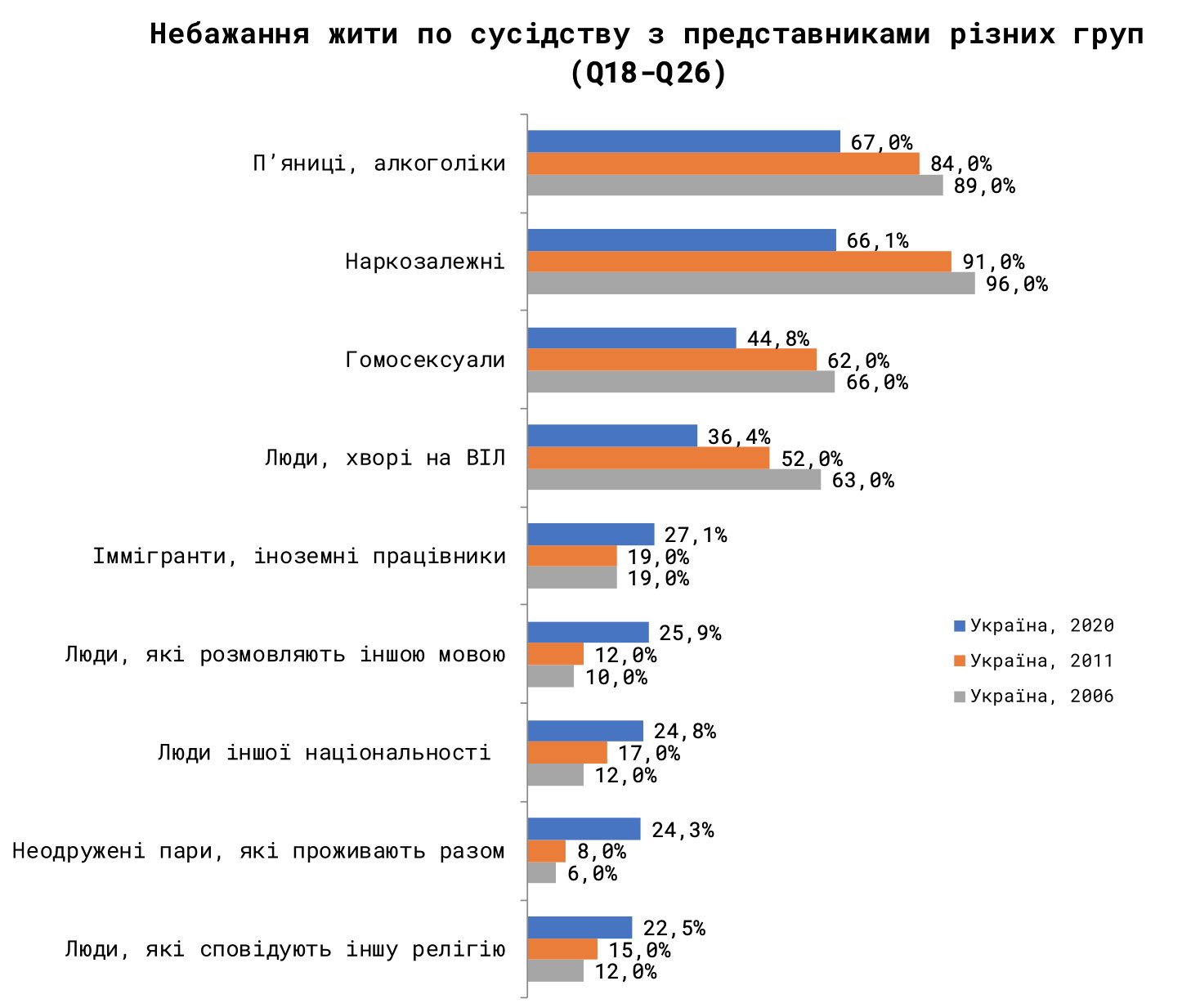 В Україні зріс рівень ксенофобії. Частка тих, хто не бажає жити по сусідству з іммігрантами, збільшилася з 19% до 27,1%, з людьми іншої національності – з 17% до 24,8%.