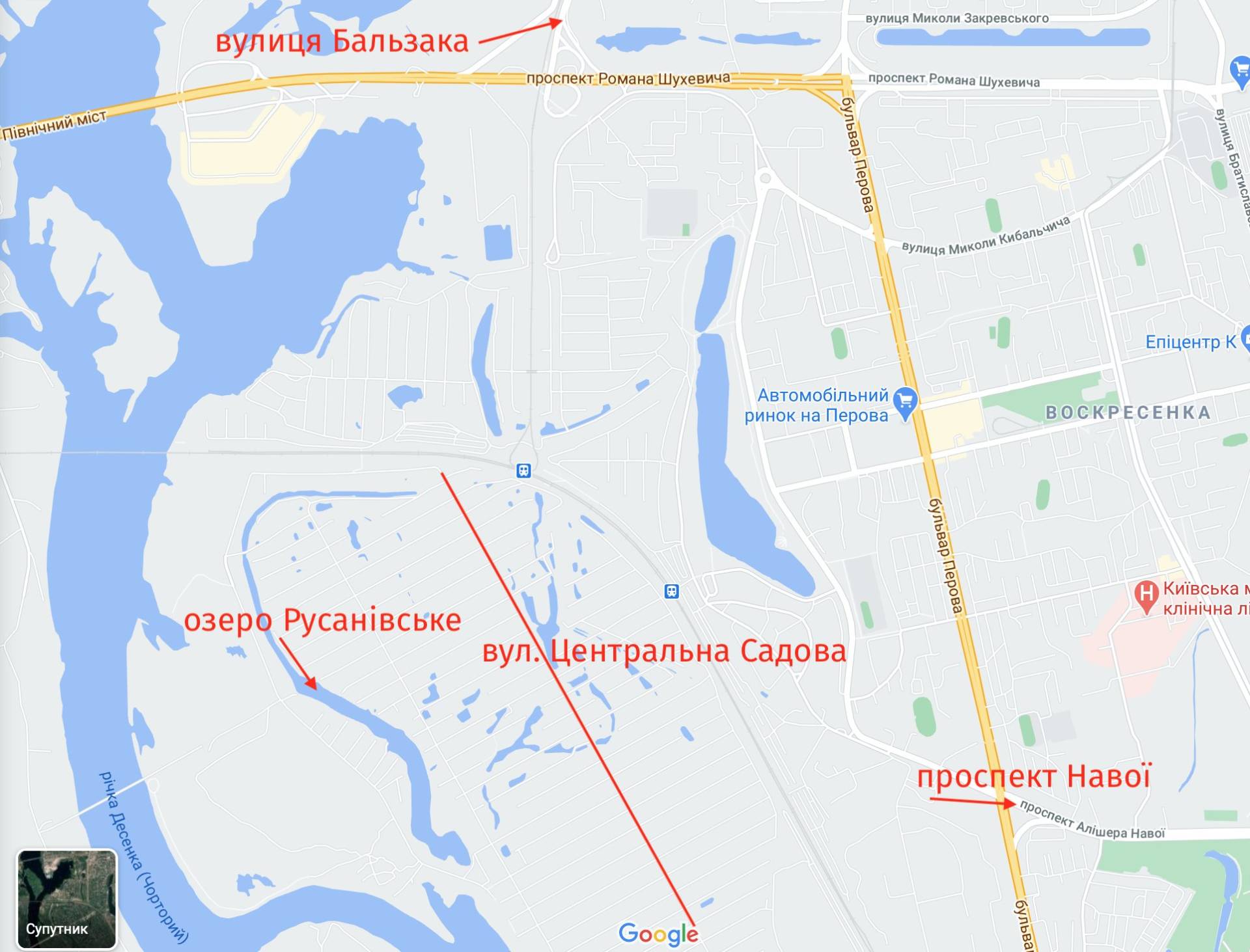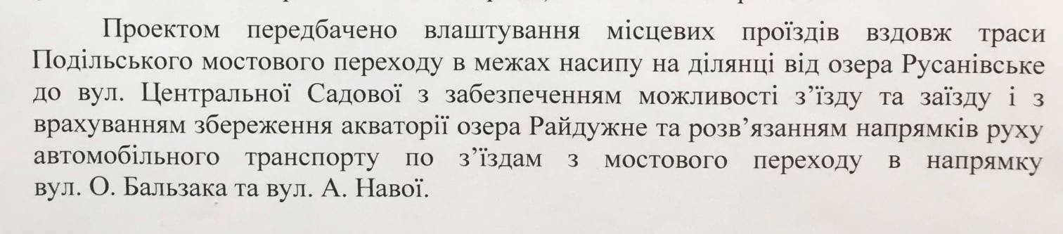 Видання зверталося до комунального підприємства з запитом щодо трасування мосту й отримало відповідь, у якій повідомлялося, що «проєктом передбачено влаштування місцевих проїздів вздовж траси Подільського мостового переходу в межах насипу на ділянці від озера Русанівське до вулиці Центральної Садової».