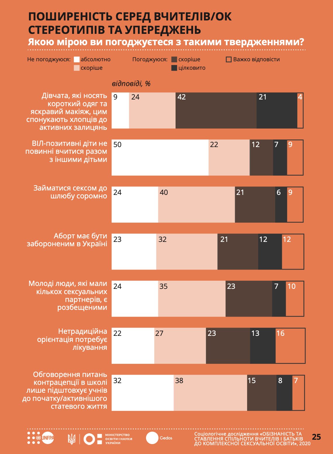63% опитаних вчителів переконані, що дівчата, які носять короткий одяг та макіяж, цим спонукають хлопців до активних залицянь. 33% вважають, що аборти мають бути заборонені в Україні. 36% заявили, що негетеросексуальна орієнтація потребує лікування. 19% впевнені, що діти з ВІЛ не мають вчитися разом з іншими дітьми. 27% вважають, що займатися сексом до шлюбу соромно.
