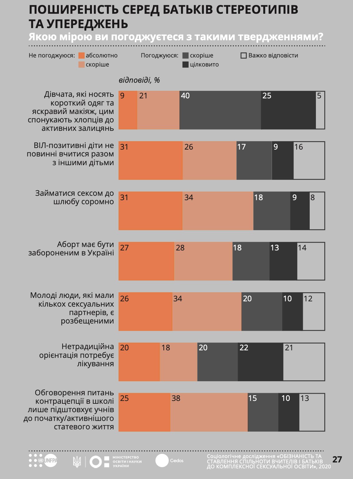 Подібні упередження характерні і для батьків. Так само 27% засуджують секс до шлюбу, 31% виступає за заборону абортів, а 65% підтримали стереотип щодо коротких спідниць. А з питань негетеросексуальної орієнтації та навчання ВІЛ-позитивних дітей батьки виявили навіть більшу упередженість, ніж вчителі, – 42% та 26% відповідно.