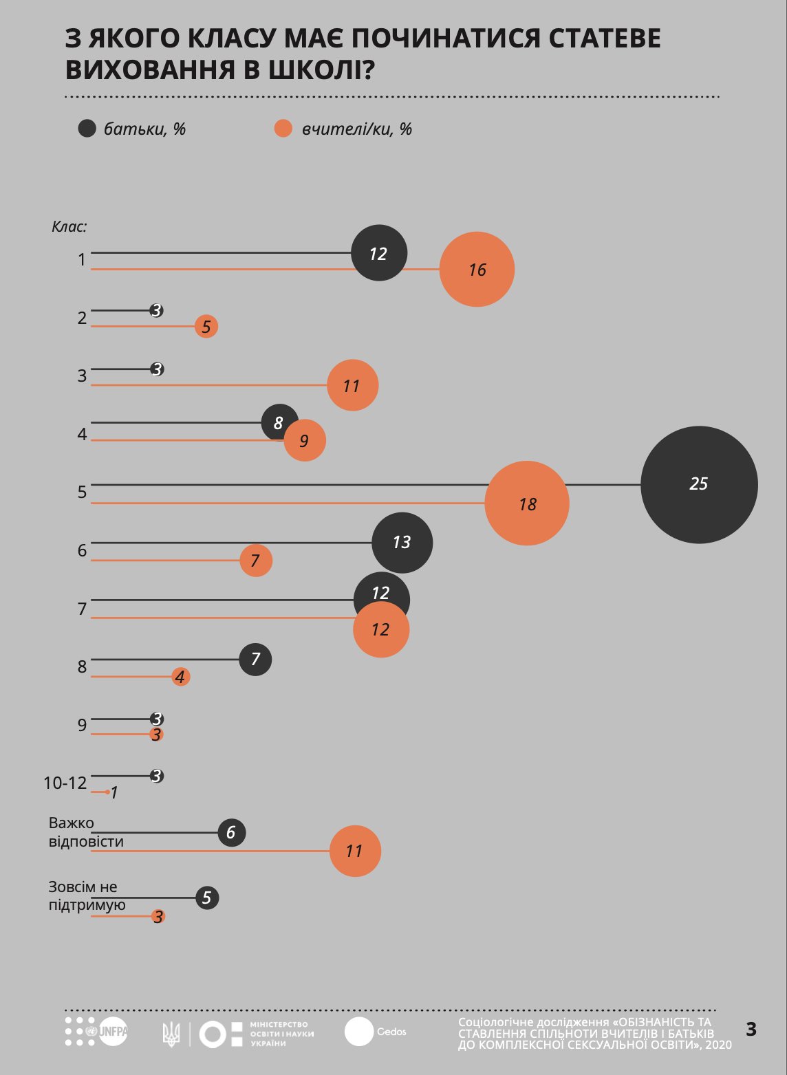 Так, виявилося, що більшість батьків і вчителів – майже 84% – підтримують формальну комплексну сексуальну освіту у школах. При цьому близько половини батьків і вчителів вважають, що до сексуальної освіти дітей слід залучити представників церкви.