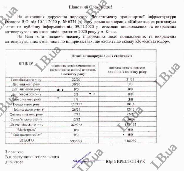 З початку 2020 року в Києві було вкрадено 316 антипаркувальних стовпчиків та 995 – пошкоджено. Про це йдеться у відповіді «Київавтодору» на запит LB.ua.
