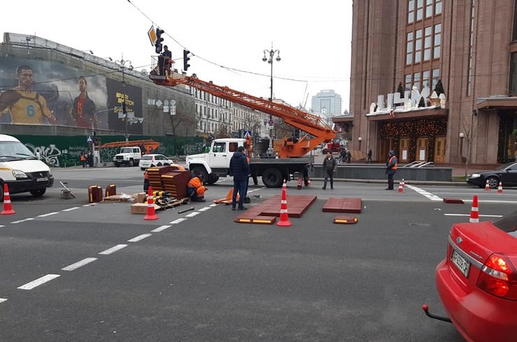 На Хрещатику біля київського Центрального універмагу на переході встановлюють зйомний острівець безпеки. Фотографії повідомив Дмитро Жовтенко у спільноті «Білий велосипед» у Facebook.