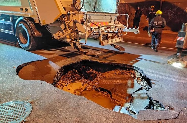 У Києві на Гончара під асфальт провалився сміттєвоз. Весною «Київавтодор» проводив там ремонт