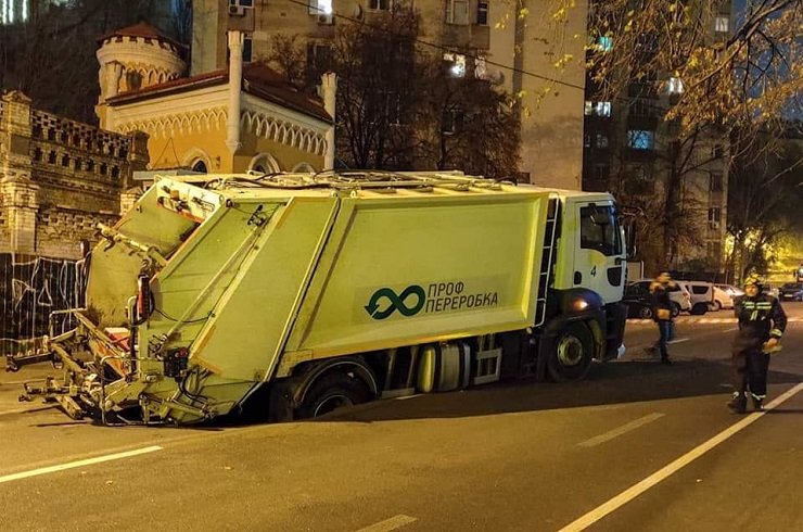 Сміттєвоз заднім колесом провалився під асфальт та не міг самостійно виїхати з ями. Щоб підняти авто, знадобилася спецтехніка. Близько 23:15 автокран «Київської служби порятунку» підняв сміттєвіз з ями. Через аварію рух вулицею Гончара в столиці перекрили.