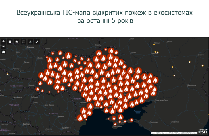 В Україні створили інструмент для аналізу пожеж у відкритих екосистемах за останні п’ять років, а також для моніторингу пожеж, що сталися за останні дві доби. Мапа розроблена Центром розвитку інновацій у співпраці з Фондом ім. Гайнріха Бьолля.