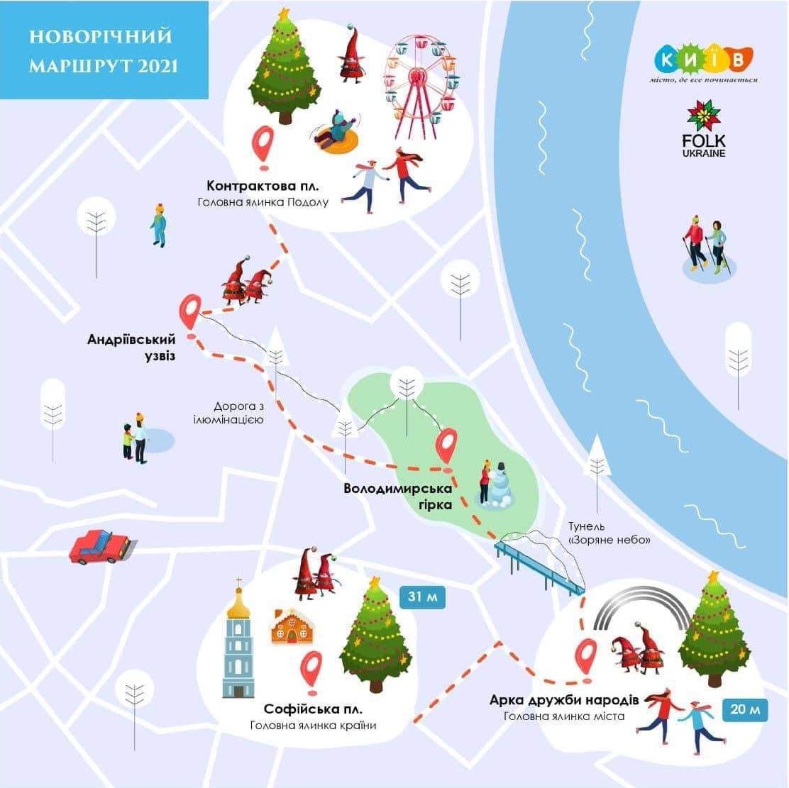 Маршрут пролягатиме від Арки дружби народів, через пішохідно-велосипедний міст, Володимирську гірку, Алею художників, Андріївський узвіз та до Контрактової площі. На кожній із локацій будуть зони для дитячих розваг – ковзанка, 20-метрове оглядове колесо, льодова гірка, – а також святкове освітлення та різдвяні прикраси. Дорогою також продаватимуть сувеніри, чай і каву.