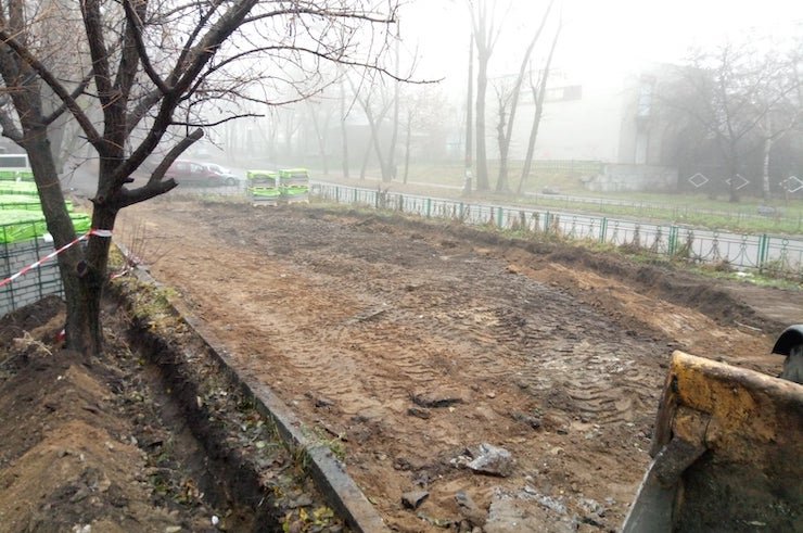Перед будівлею Київської школи економіки на вулиці Шпака, 3 будівельна техніка зняла покриття з тротуару та шар ґрунту з зеленої зони. Про це повідомив киянин Павло Постоєнко.