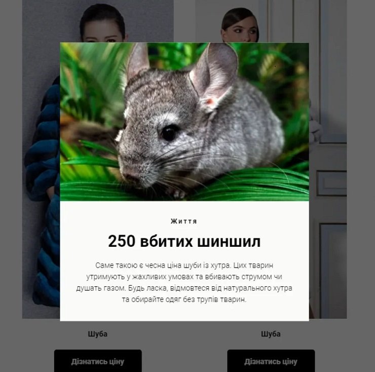 Рух UAnimals створив онлайн-магазин натурального хутра. Організатори повідомляють, що особливість крамниці полягає в «максимально чесній ціні» – у кількості тварин, яких вб’ють заради шуби.