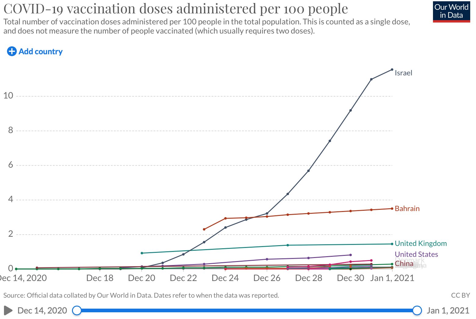 За абсолютною кількістю вакцинованих людей веде перед Китай із показником 4,5 мільйона доз. Також позначку в мільйон доз перетнули США та Велика Британія, яка почала вакцинацію першою.