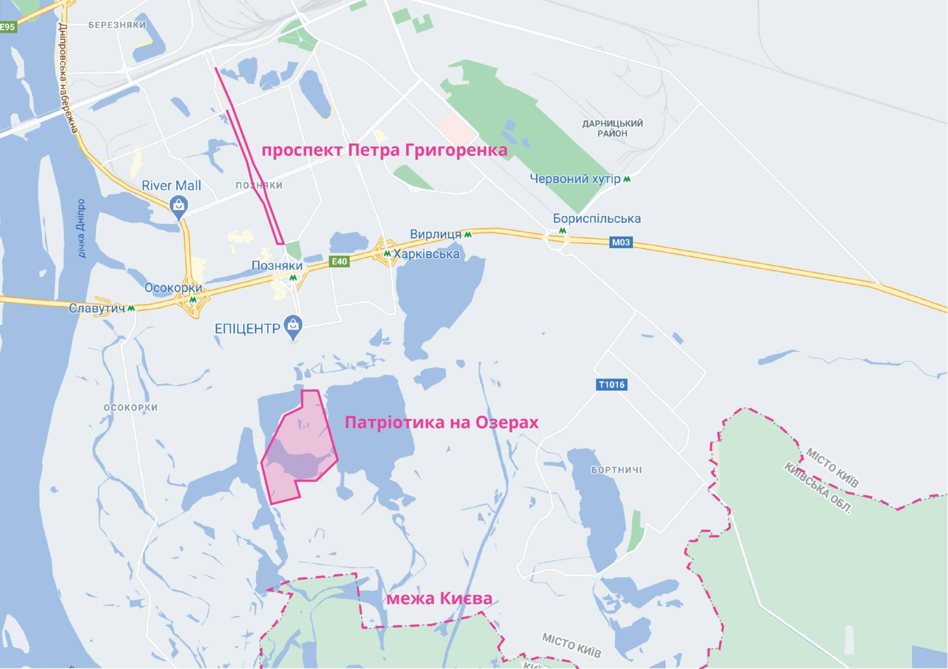 Між проспектом Григоренка та межею Києва розташовано зелену зону з озерами Небреж і Тягле, де місцеві мешканці вимагають облаштувати «Екопарк Осокорки». Водночас там само нині збанкрутілий банк «Аркада» планував збудувати багатоповерховий ЖК «Патріотика на озерах».