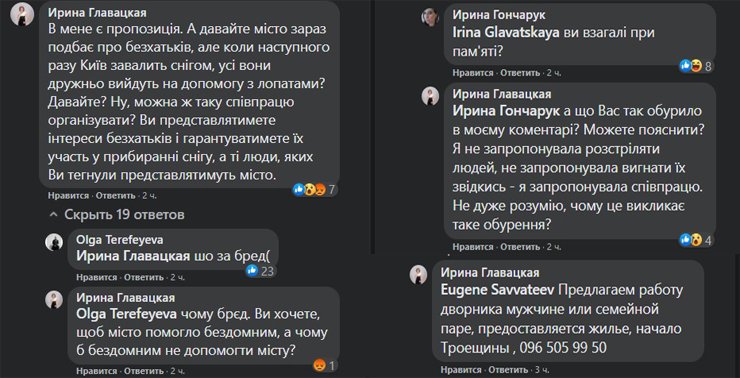 Серед людей, що відреагували на допис волонтера, своїми коментарями вирізнялася журналістка муніципального телеканалу «Київ» Ірина Главацька. Вона запропонувала організувати бездомних для прибирання снігу, якщо місто «зараз про них подбає», а також почала скидати оголошення про вакансії.