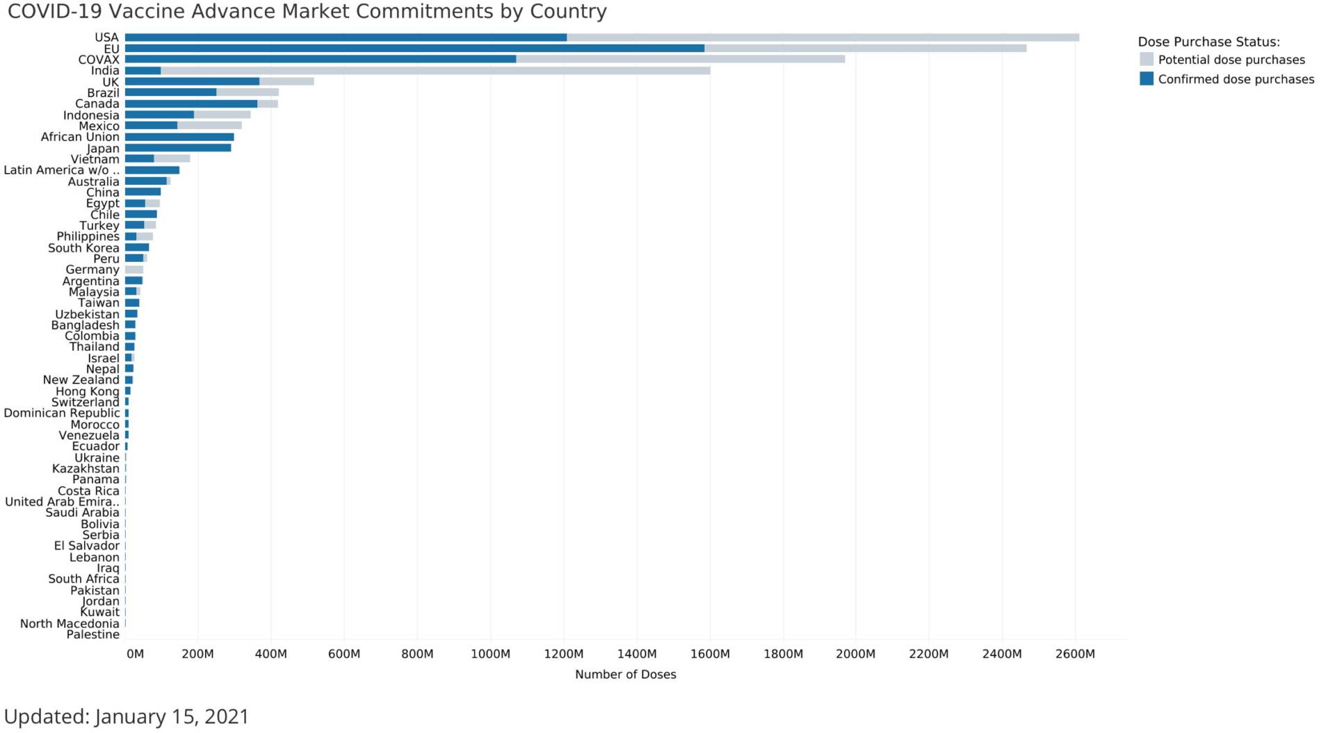 Кількість передзамовлених доз різними країнами. Темно-синім позначено підтверджену кількість передзамовлень. Графік: launchandscalefaster.org