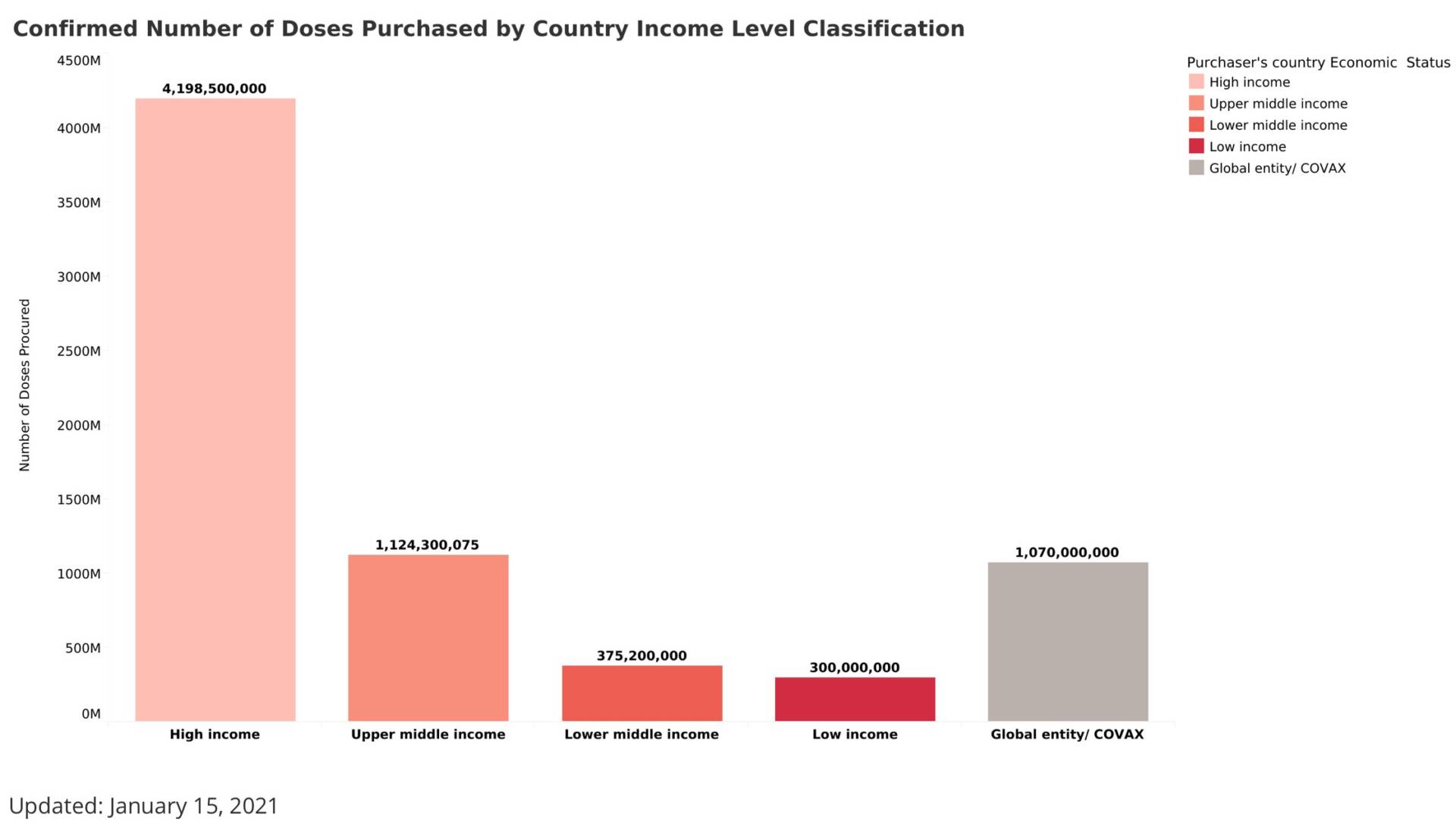 Народний альянс за вакцини підрахував, що 100% вакцин Moderna і 96% Pfizer/BioNTech передазамовили заможніші країни, де живе лише 18% населення світу. Першою масова вакцинація почалася у Великій Британії, Канаді, США, Китаї та Росії.