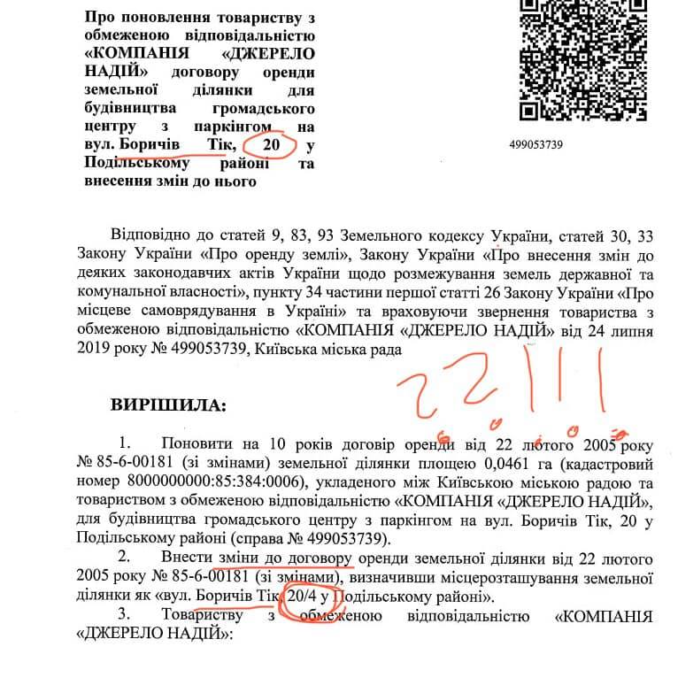 Юрист ініціативної групи «Мапа реновації» Дмитро Перов звертає увагу, що у проєкті рішення йдеться про зміну місцерозташування ділянки – пропонують змінити адресу Боричів Тік, 20 на Боричів Тік, 20/4.