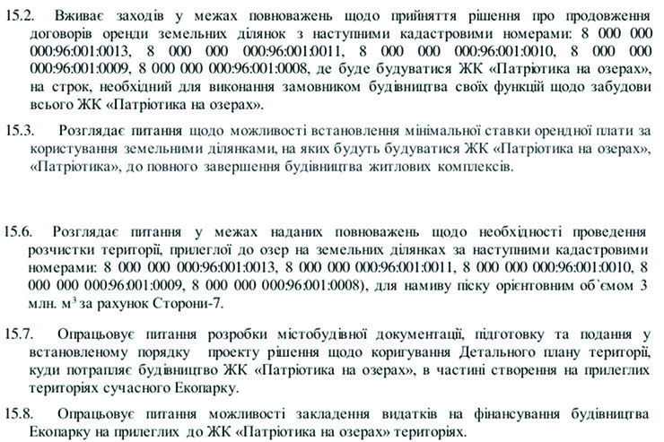 Меморандум передбачає продовження договорів оренди ділянок, де будуватиметься «Патріотика на озерах»; встановлення мінімальної орендної ставки; «розчищення прилеглої до озер території» і намивання трьох мільйонів кубометрів піску.