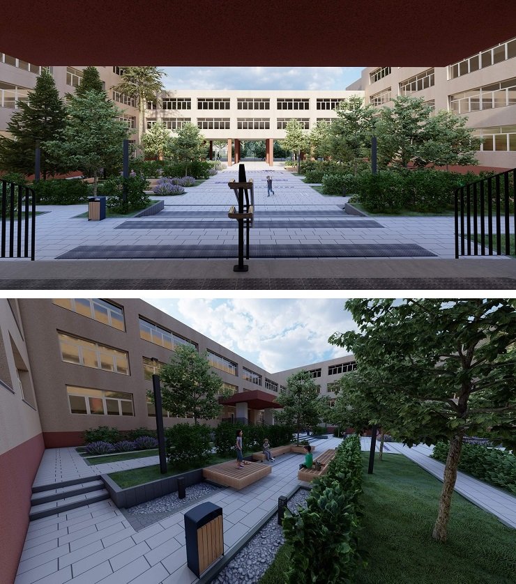 Згідно з проєктом, на вхідній групі облаштують пандус та тактильну плитку, встановлять велопарковку, дерев’яні дизайнерські лавки, смітники та освітлення. Подвір’я школи буде озеленене, а на асфальті будуть намальовані ігри для школярів.